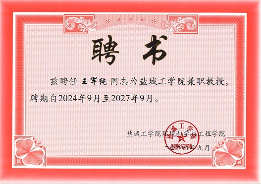王軍純被聘為鹽城工學院環境學院兼職教授及研究生企業實踐指導教師